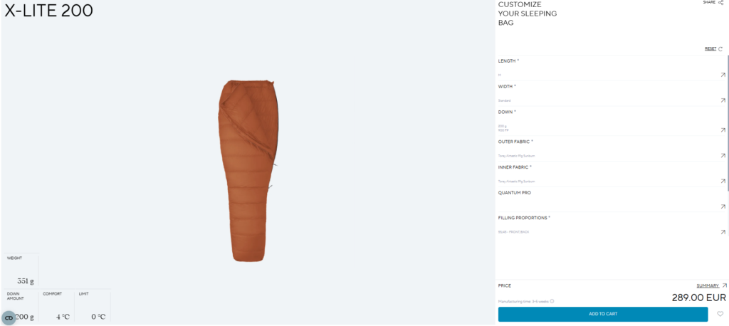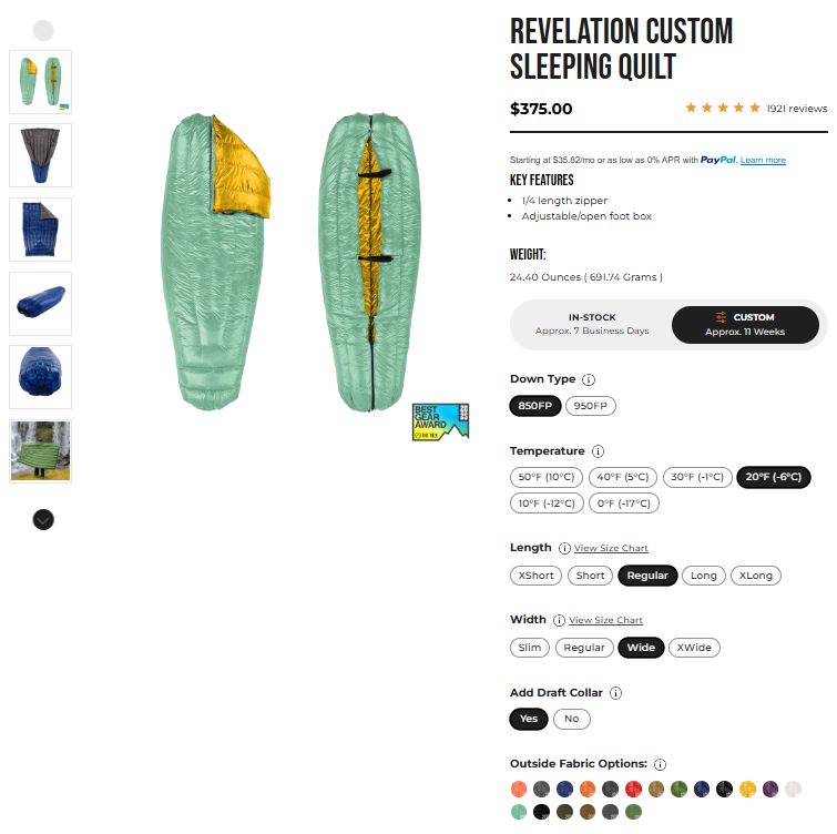 海外メーカーということもあり、どうしても高額になってしまいますが、どうせシュラフは高額なものなので、一生モノと思ってカスタムオーダーするのもアリではないでしょうか。
